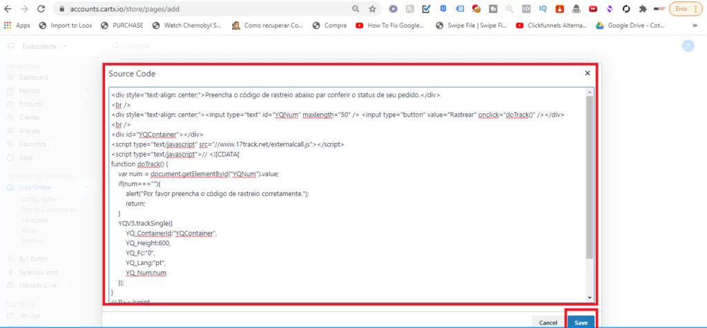 Passo a passo da instalação do script de rastreamento de uma loja de dropshipping CARTX.